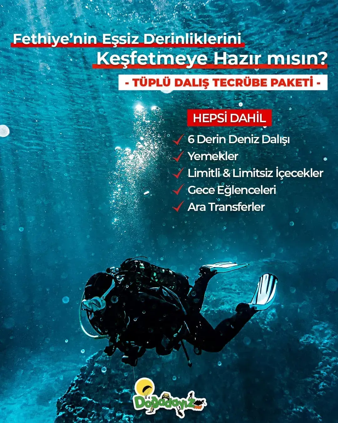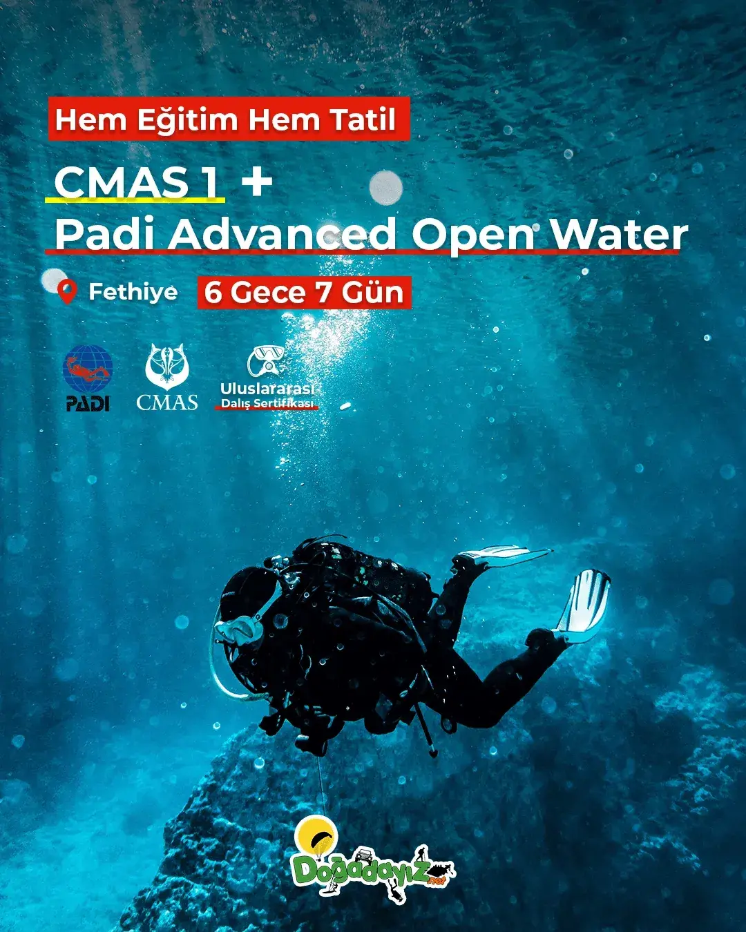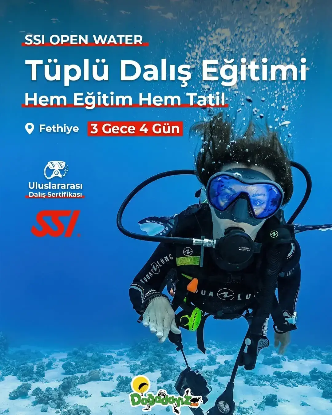 Türkiye’nin adrenalin merkezi Fethiye / Ölüdeniz ve çevresinde unutulmaz bir aktivite tatili planlarken, aynı zamanda profesyonel eğitimlerle yetkinlik kazanabilirsin. Fethiye / Çalış konaklama avantajlarıyla bölgenin tadını çıkarırken; uzman eğitmenler gözetiminde scuba diving (tüplü dalış), Marmaris ve çevresindeki nehirlerde rafting veya Babadağ’ın eşsiz manzarasında yamaç paraşütü gibi branşlarda başlangıçtan ileri seviyeye kadar eğitim alabilir, sertifikalı ve lisanslı bir sporcuya dönüşerek hobini profesyonelliğe taşıyabilirsin.