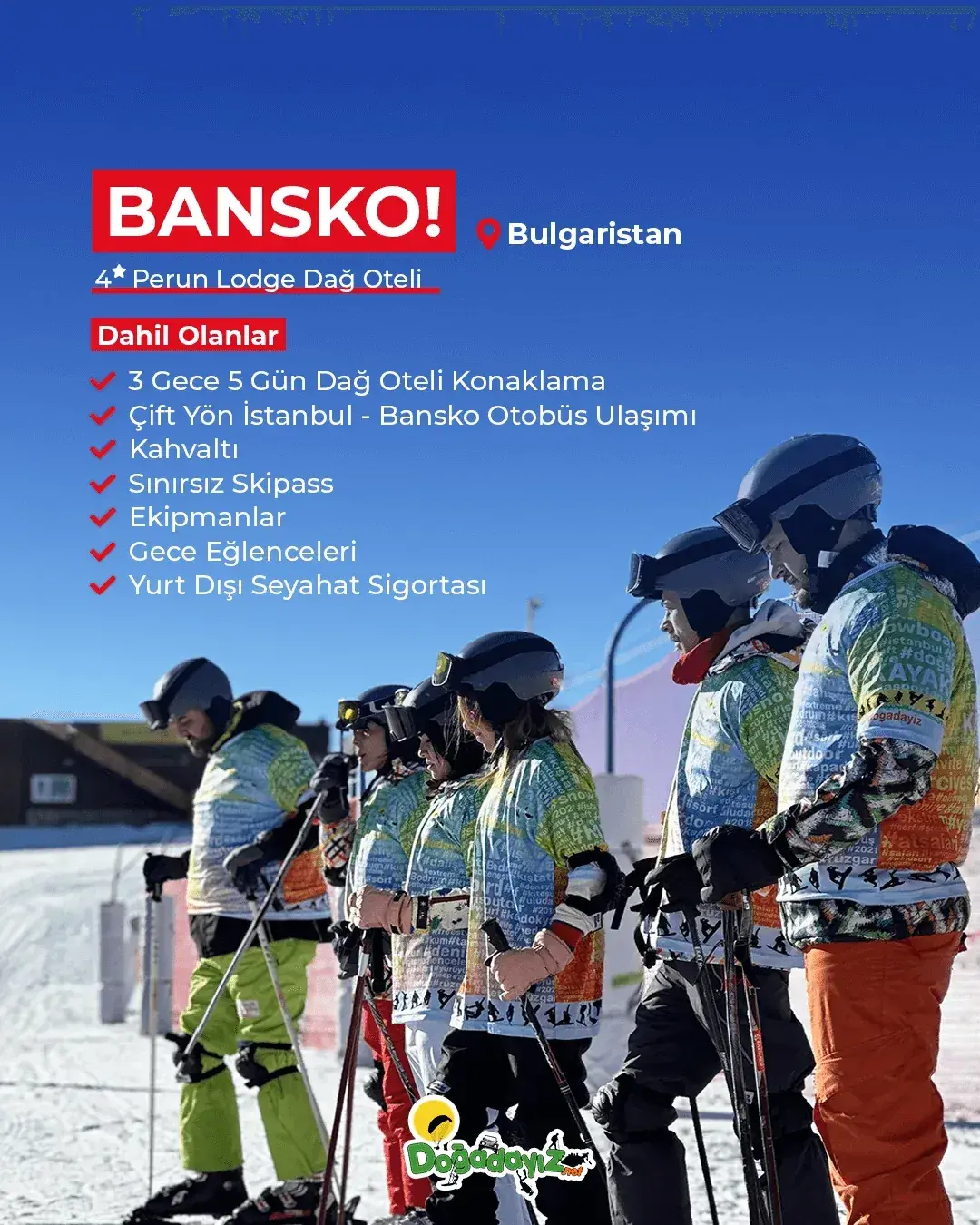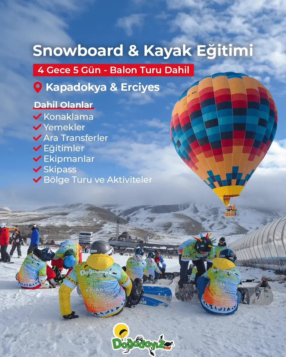 Kar kalitesiyle ünlü Erciyes / Kayseri, kristal karın merkezi Sarıkamış / Kars ve Avrupa’nın en popüler kayak rotalarından Bansko / Bulgaristan kayak merkezlerinde adrenalin dolu bir kış serüvenine hazır olun! Profesyonel eğitmenlerden alacağınız snowboard eğitimi ve kayak dersleri ile tekniğinizi geliştirirken; uzman rehberler eşliğinde düzenlenen bölge turları ve sınırsız pist pratikleriyle hayalinizdeki kış tatili deneyimini konforla birleştirebilirsiniz.
